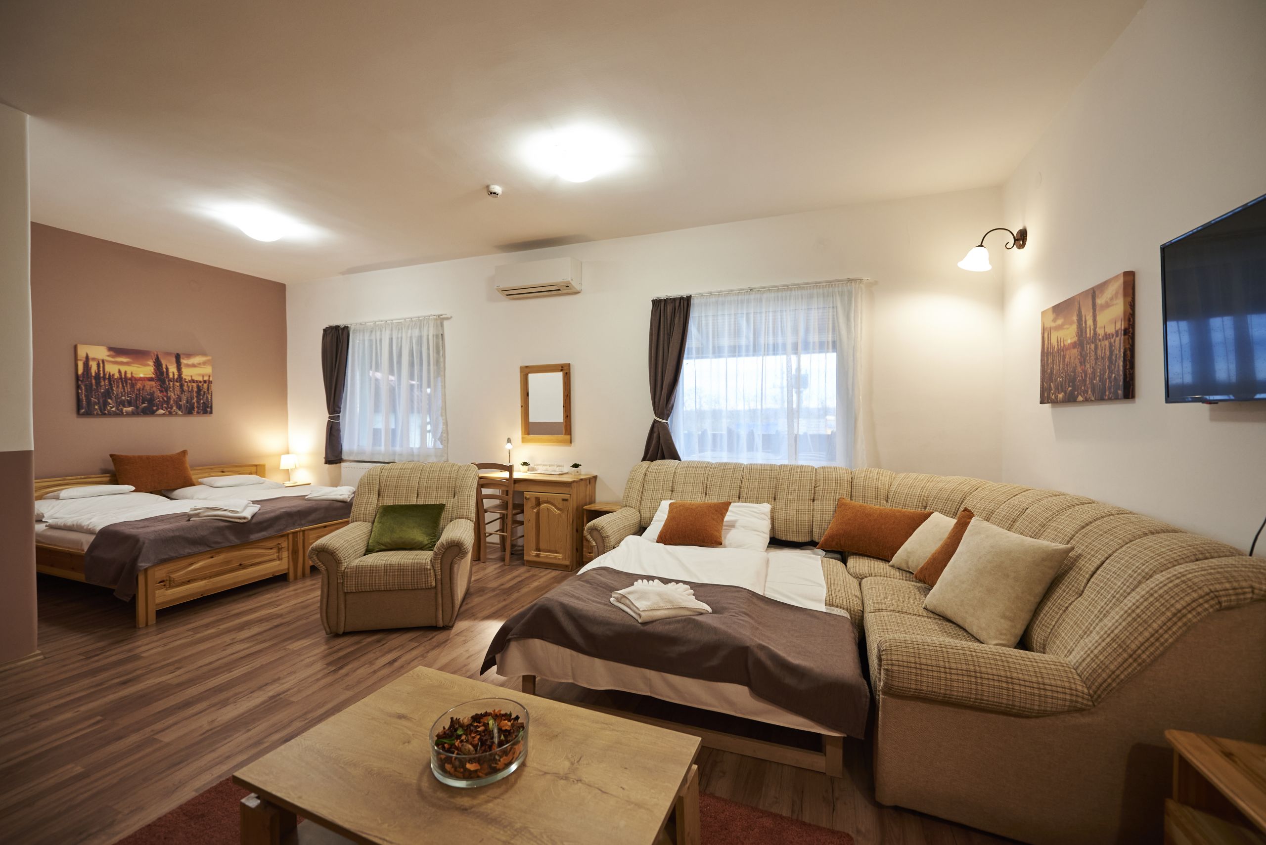 - 13 m2-es szoba kihúzható kanapéval (kanapé mérete: 1,4 m x 2,2 m)